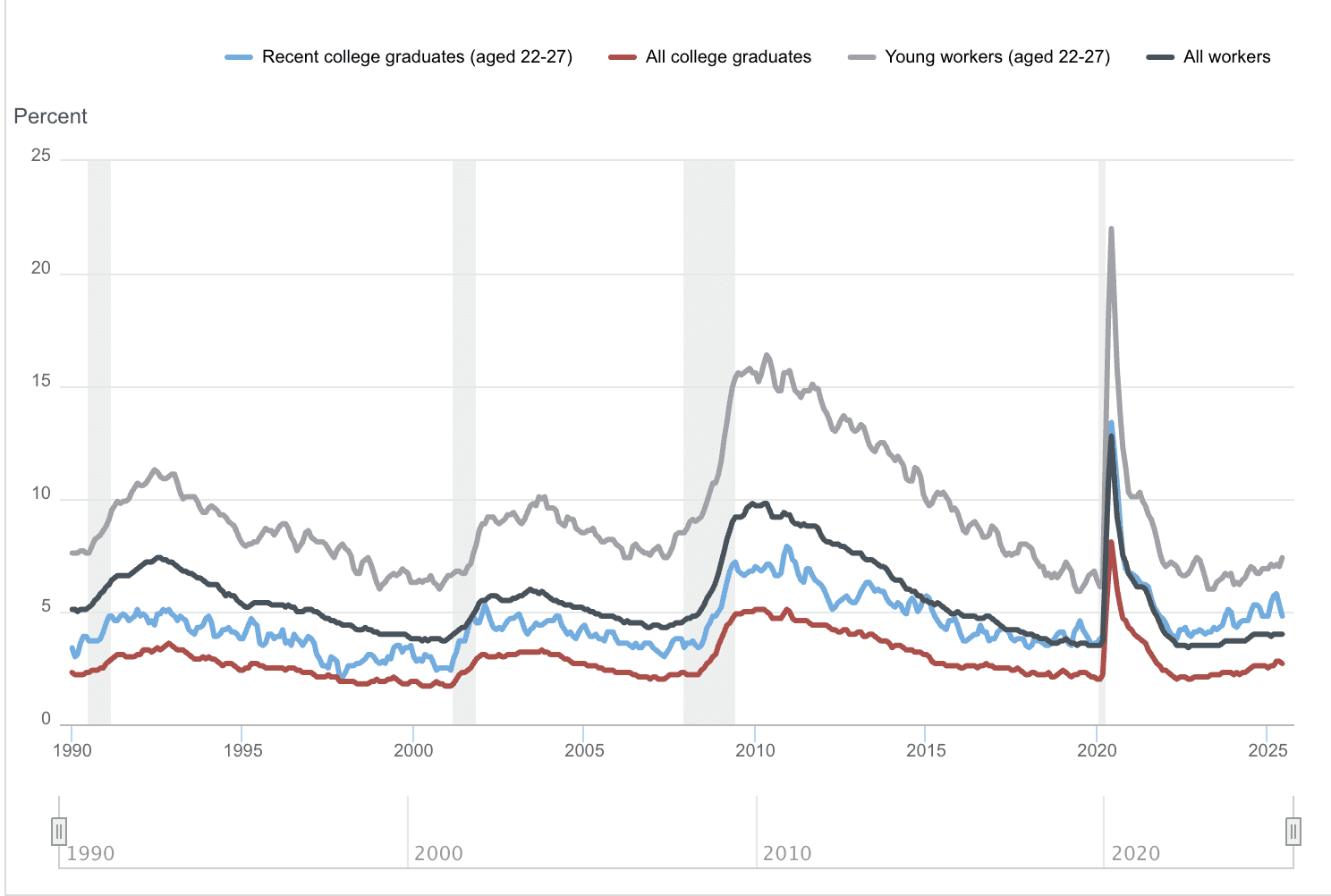 This isn't evenly distributed either. Goldman Sachs economist Joseph Briggs noted that unemployment for 20-30 year olds in tech increased by about 3% in early 2025—a "much larger increase" than in tech broadly or among young workers in other sectors.