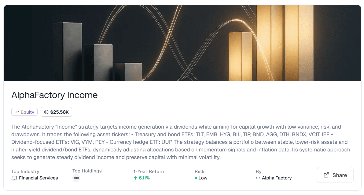 In a market chasing the next volatile "moonshot," true sophistication lies in the steady accumulation of cash. One way to systematically outpace the hype is by leveraging the AlphaFactory Income Strategy on Surmount. By dynamically rotating between core dividend ETFs like VIG, VYM, and PEY and defensive anchors like TLT and UUP, this approach replaces emotional guesswork with data-driven precision. It balances the high-yield potential of "boring" stocks with the stability of Treasury and bond ETFs, adjusting allocations based on momentum and inflation signals.