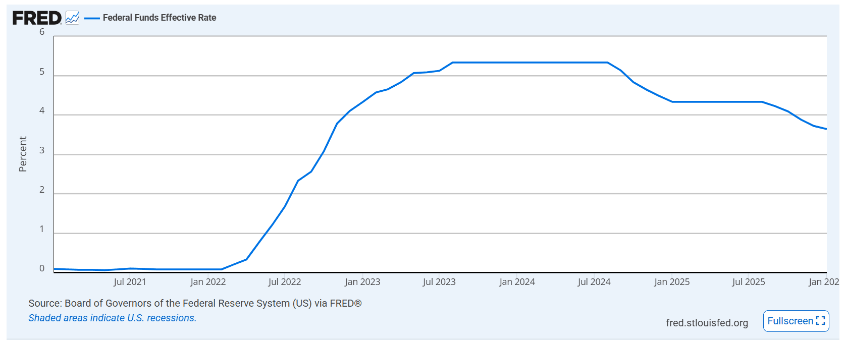 Throughout 2023 and into 2024, investors were earning 5.33% in “risk free” savings, as per the federal funds effective interest rate. In the months that followed, however, the Fed had systematically begun to take its foot off the brake, and pivot away from aggressive tightening.