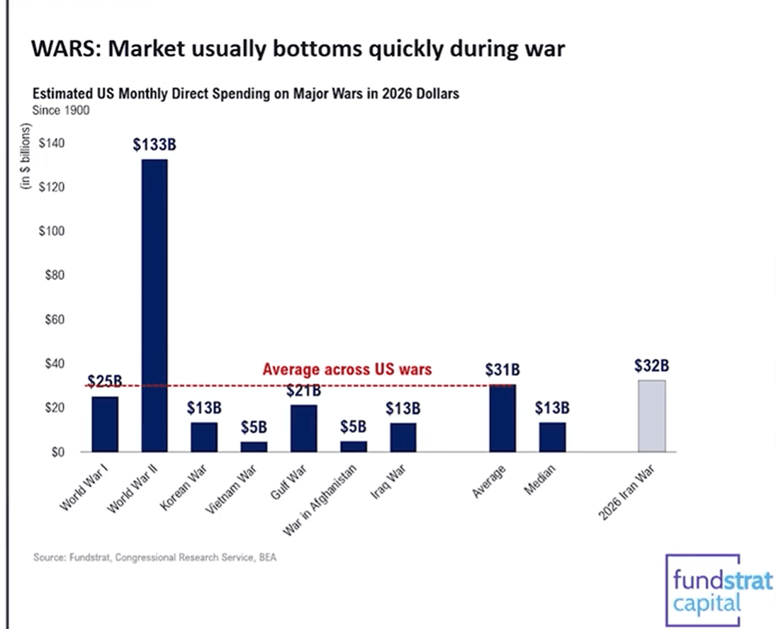 According to data analyzed by Fundstrat’s Tom Lee, the U.S. has averaged $32 billion per month in inflation-adjusted spending across the last seven major conflicts.