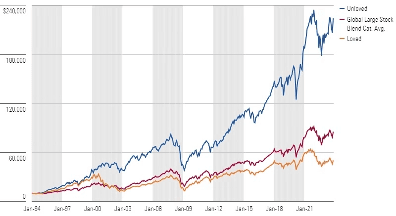 Morningstar's "Buy the Unloved" strategy, tracked for 30 years since 1994, has consistently outperformed both momentum strategies and market averages. The approach is simple: invest in the three equity categories with the most outflows from the previous year, hold for three years, repeat. The results? The unloved approach easily outpaced the loved approach and the global large-stock blend category average.