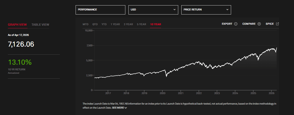 Recently, the S&P 500 is trading at record highs, closing at a new peak of 7,126.06 on April 17, with an intraday high of 7,147.52. The index surged 12% in 11 sessions, the fastest rally since 1928, driven by easing Middle East tensions.